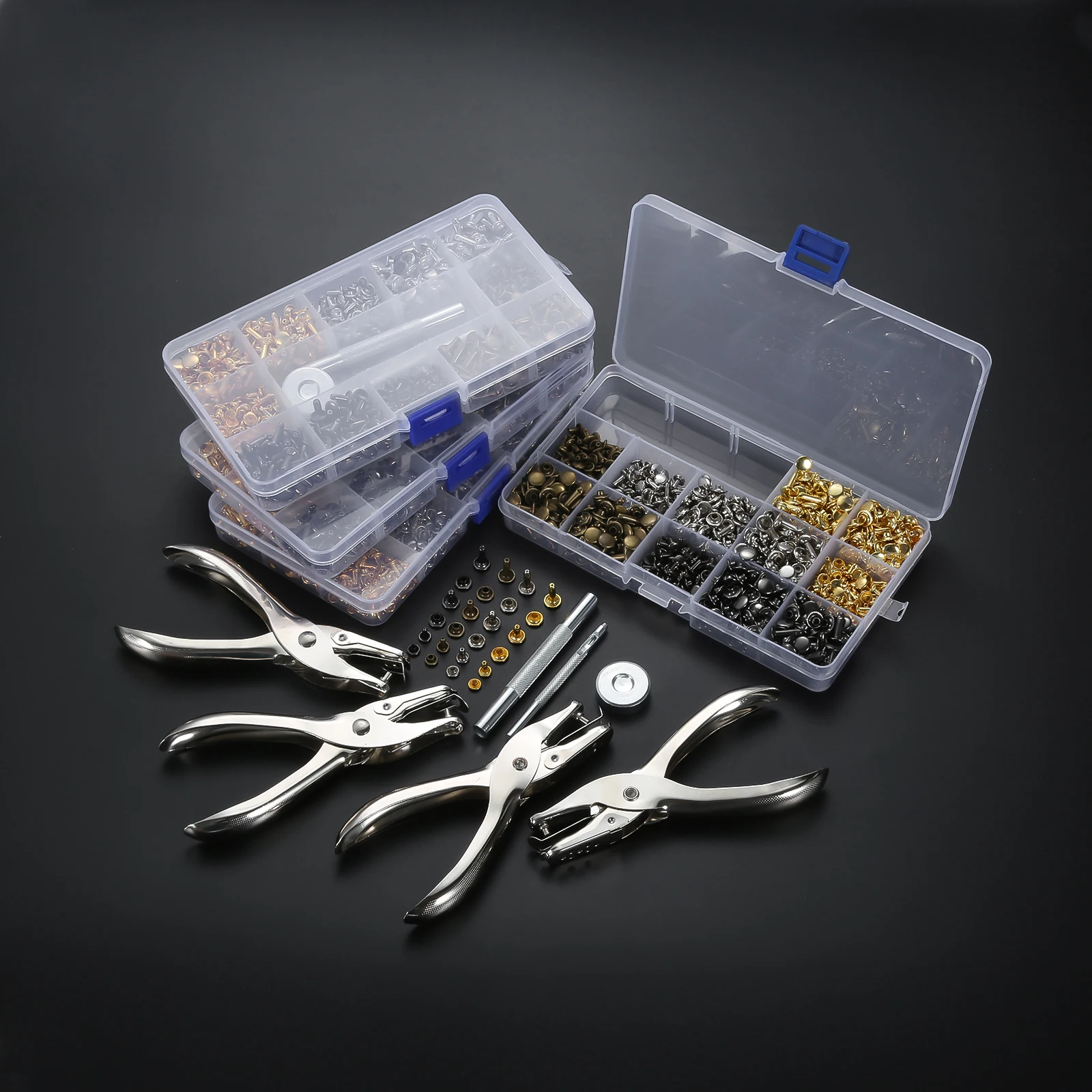 Very Recommended - 240/300/360/480kits Leather Rivets Double Cap Metal Press Studs Snap Button 3-Size 4-Color Punch Pliers DIY Leather Craft Tool