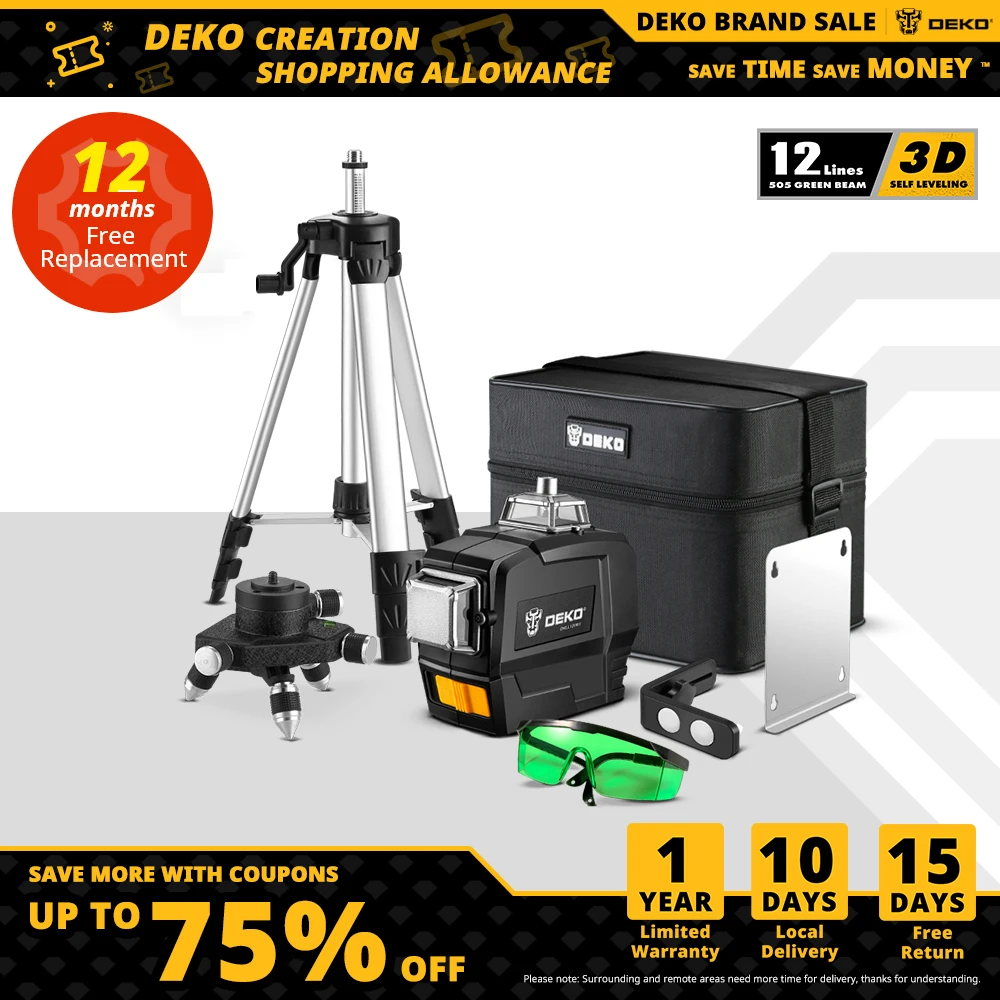 Coupon code for DEKO DKLL12 Series Laser Level Professional Construction Tools 12 Lines Green Self-leveling 360 4D Powerful Measuring Tripod On Sale